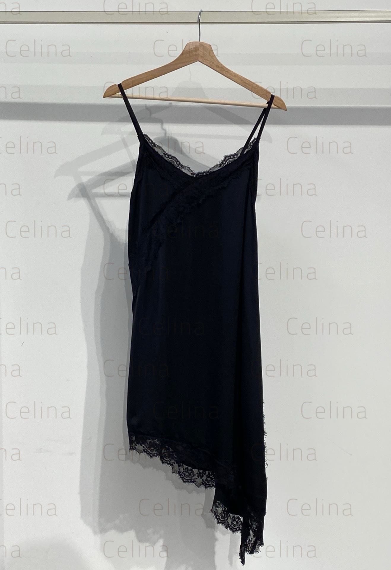Vestido lencero asimétrico en raso satinado con encaje. Apertura lateral.