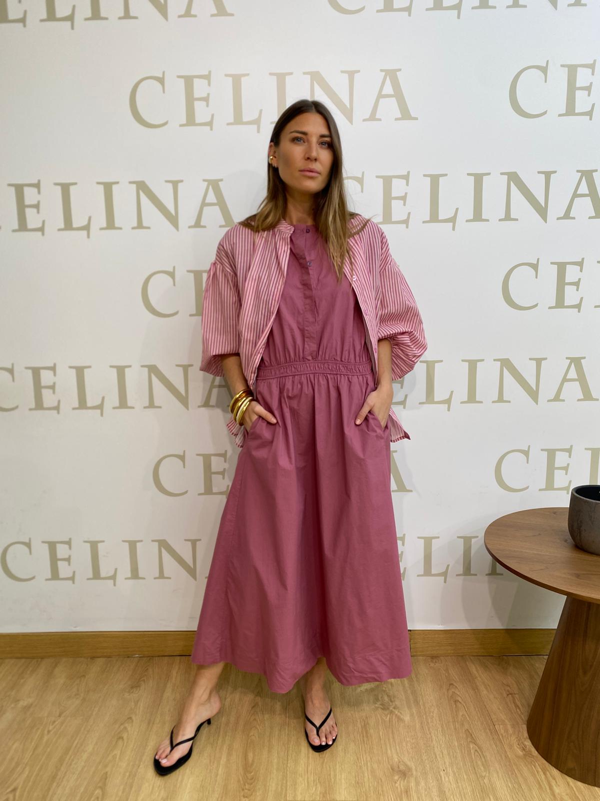Vestido midi de silueta fluida. Cuello caja, con cierre de botones invisible frontal hasta la cintura. Mangas cortas, tipo japonesas; integradas. Falda amplia con caida fluida. Cintura fruncida con goma elástica.