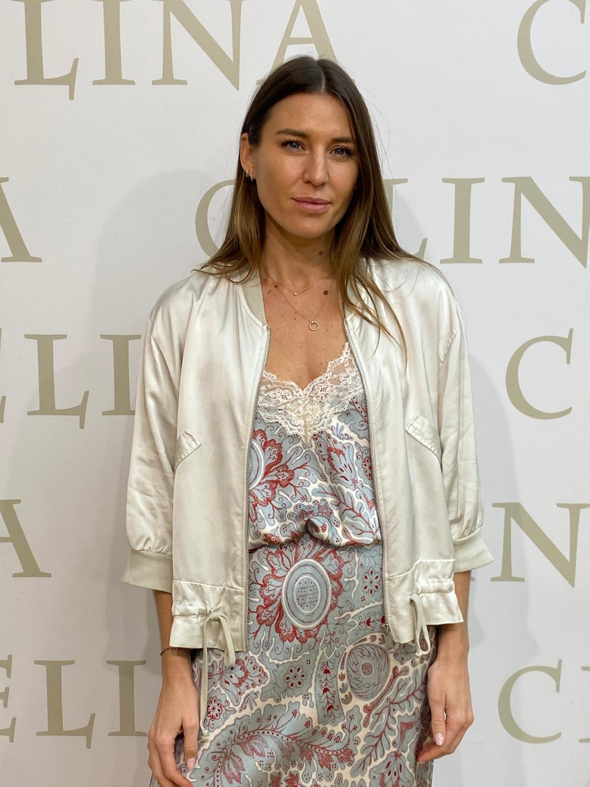 Bomber de manga francesa con cordón ajustable en la cintura. Satinado.