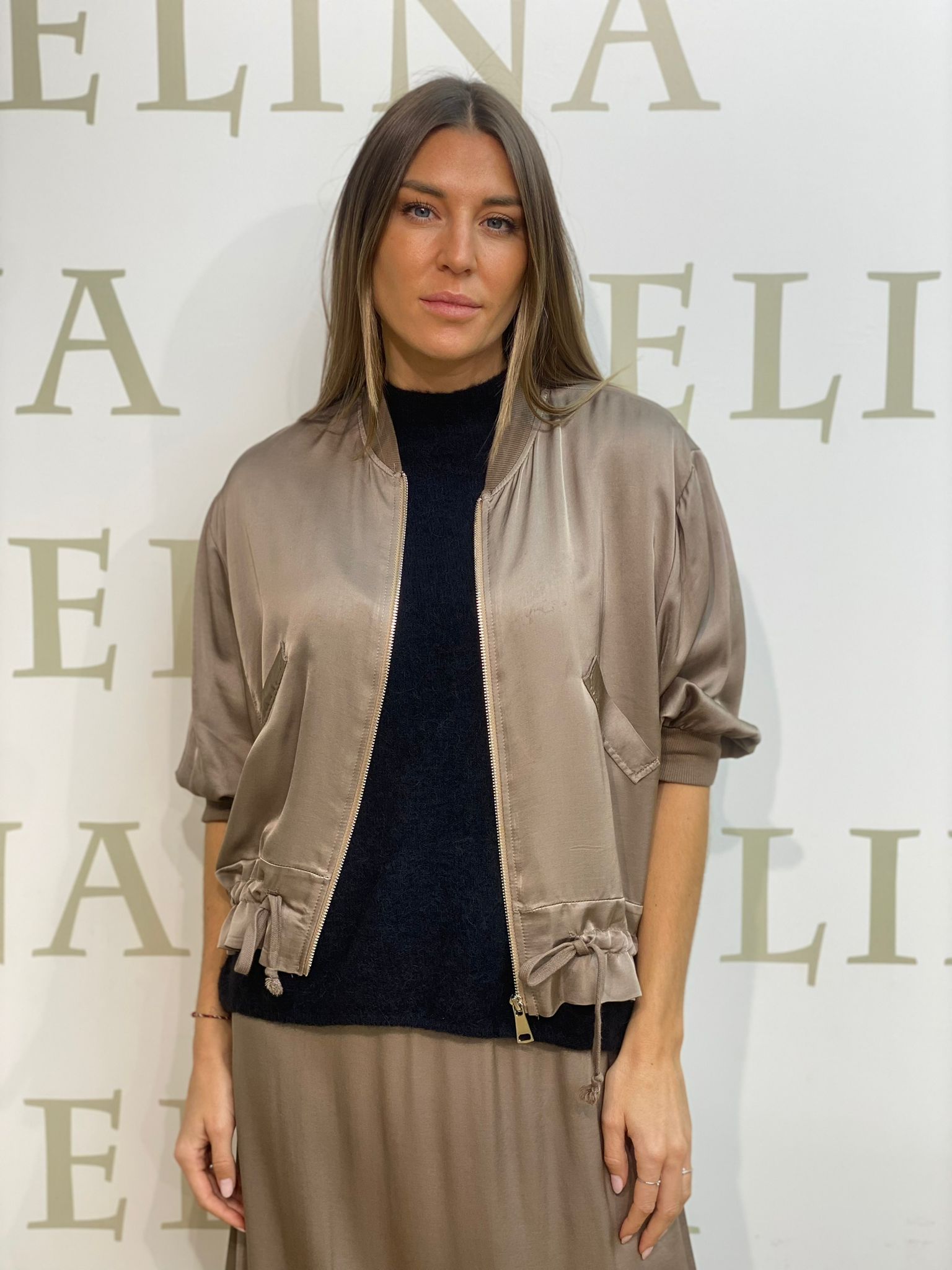 Bomber de manga francesa con cordón ajustable en la cintura. Satinado.